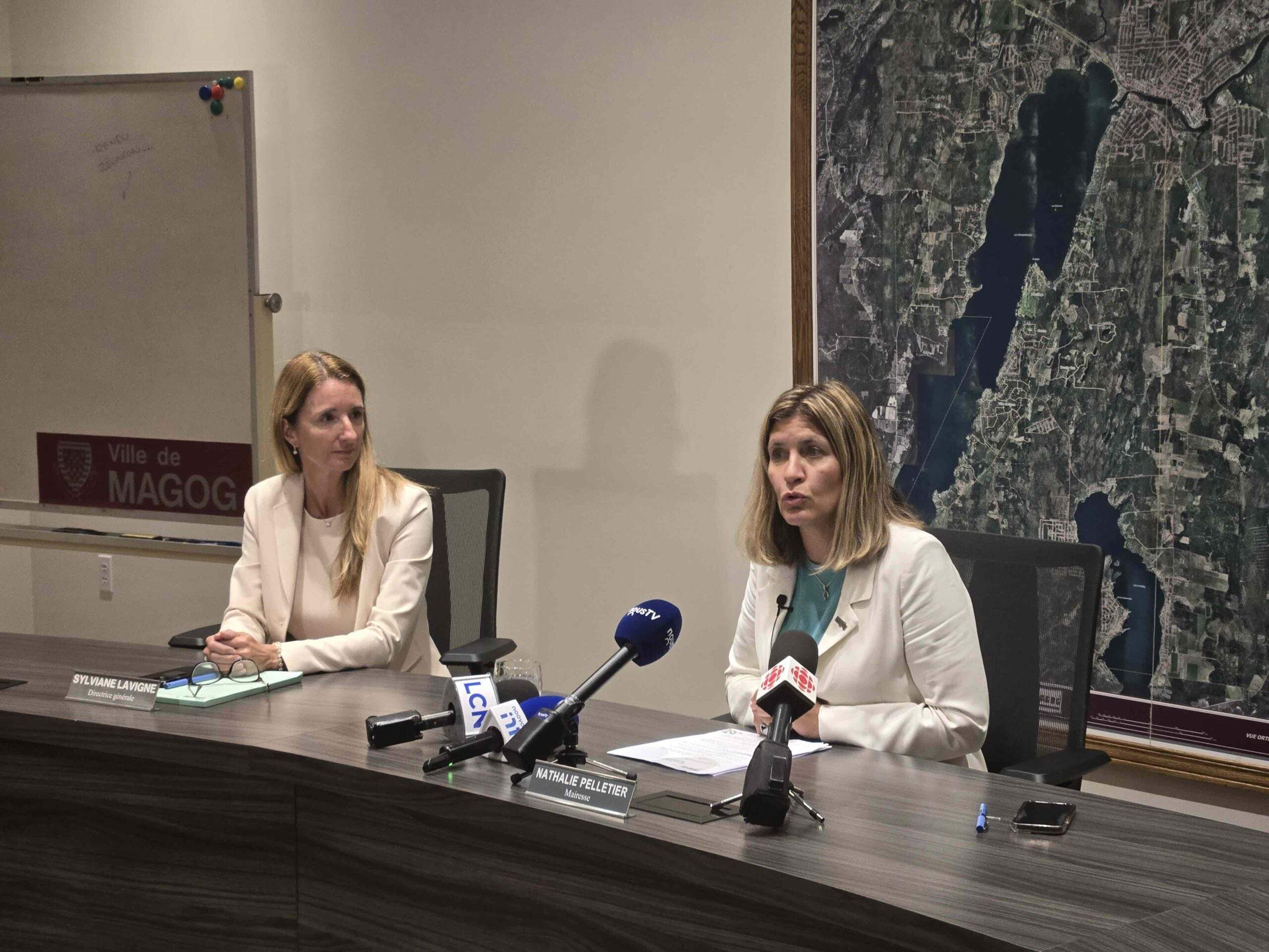 Sylviane Lavigne, director general, listens attentively as Mayor Nathalie Pelletier delivers her remarks during Tuesday’s press conference at Magog city hall