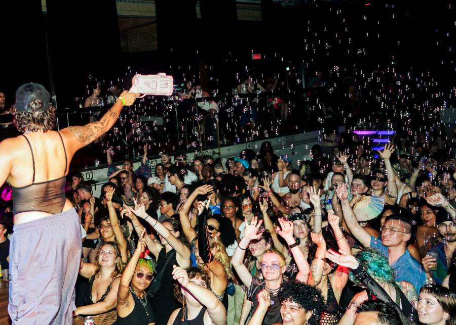 Ray Resvick from MESSY sprays bubbles over the crowd at Bain Mathieu during the MESSY x Wild Pride event. Photo Belén Catalán
